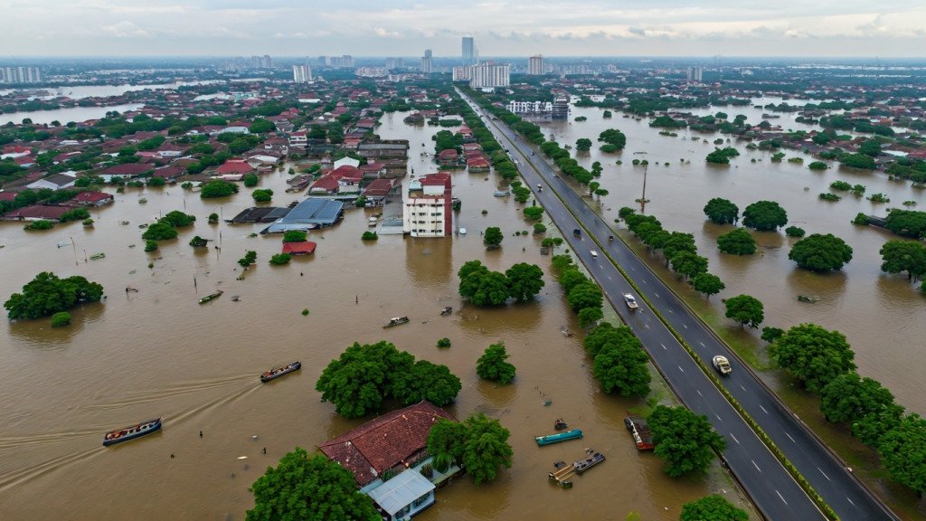Selain permukiman warga, sejumlah ruas jalan vital juga terendam, memperparah kemacetan dan menyulitkan mobilitas: