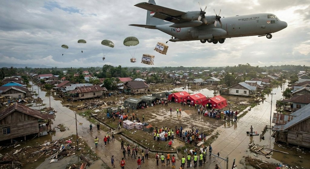 Bantuan tahap awal dan lanjutan telah tiba di sejumlah bandara. Lokasi pendaratan meliputi Silangit di Tapanuli Utara, Pinangsori, Padang Pariaman, Lhokseumawe, dan Langsa di Aceh. Distribusi ke lokasi bencana dilakukan melalui jalur darat dan sungai. Truk dan perahu karet LCR dikerahkan. Daerah terisolasi menerima bantuan melalui metode air drop.