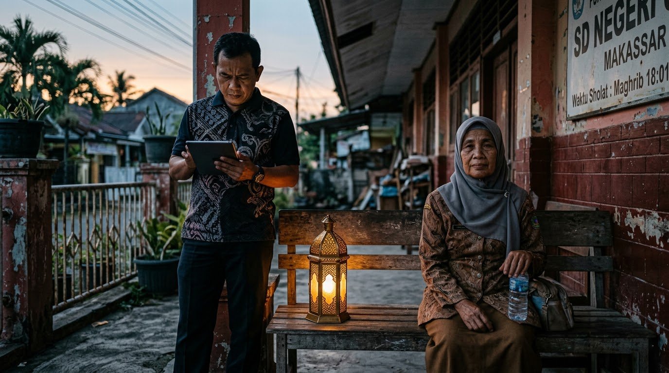 Saat mengantar paket ke sebuah sekolah di pinggiran kota, saya melihat seorang guru honorer duduk di depan kelas, menunggu azan dengan wajah tenang yang dibalut kelelahan yang jujur.