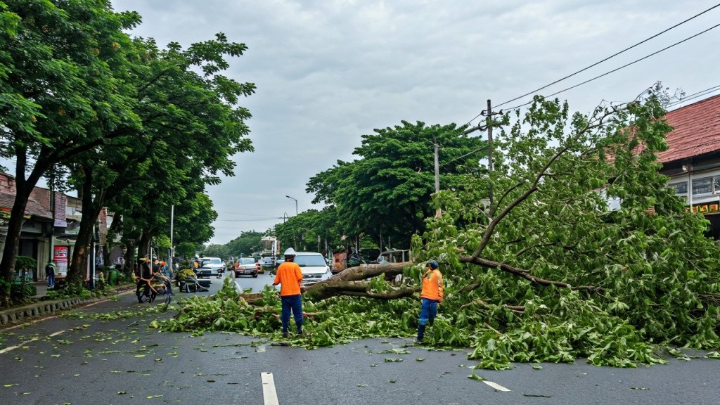 - Pemangkasan intensif dilakukan pada pohon rawan di ruas jalan utama selama musim hujan.