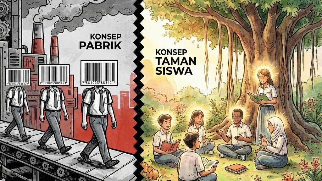 Dalam bahasa Yunani kuno, ada konsep Paideia, yang berarti pembentukan manusia ideal secara utuh—fisik, mental, dan spiritual. Di Indonesia, Bapak Pendidikan kita, Ki Hajar Dewantara, sudah meletakkan fondasi serupa lewat konsep “Taman Siswa”. Perhatikan kata “Taman”. Taman adalah tempat tumbuh kembang yang alami, menyenangkan, dan memanusiakan. Bukan “Pabrik Siswa”.