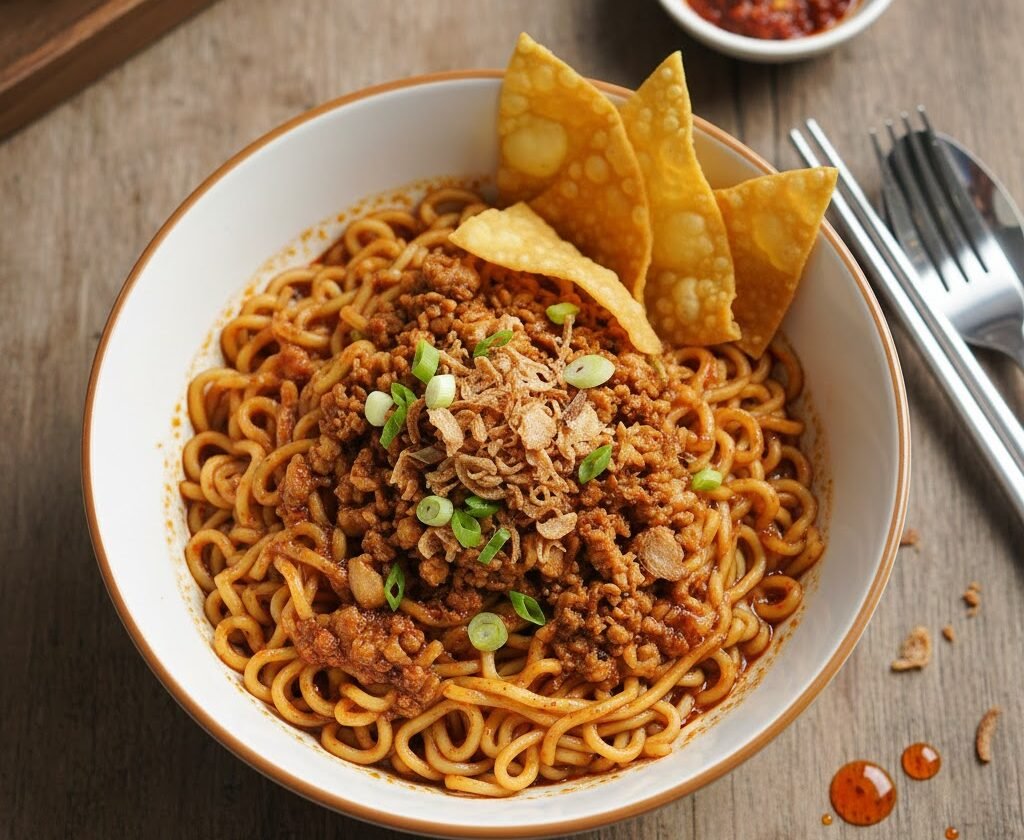 Terakhir, tata topping di atas mie. Taburi dengan ayam cincang yang sudah dihaluskan, bawang goreng dari minyak bawang, pangsit goreng yang renyah, dan irisan daun bawang segar. Sajikan selagi hangat.
