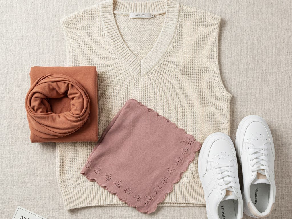 Layering (teknik menumpuk pakaian) adalah kunci untuk look yang lebih “mahal” dan stylish. Dua outerwear yang wajib dimiliki adalah Knit Vest (rompi rajut) dan Oversized Blazer. Rompi rajut di atas kemeja putih atau dress polos memberikan vibe academic/preppy. Sementara oversized blazer (terutama warna netral seperti hitam atau krem) langsung mengubah look simpel (kaos dan jeans) menjadi smart casual yang keren.